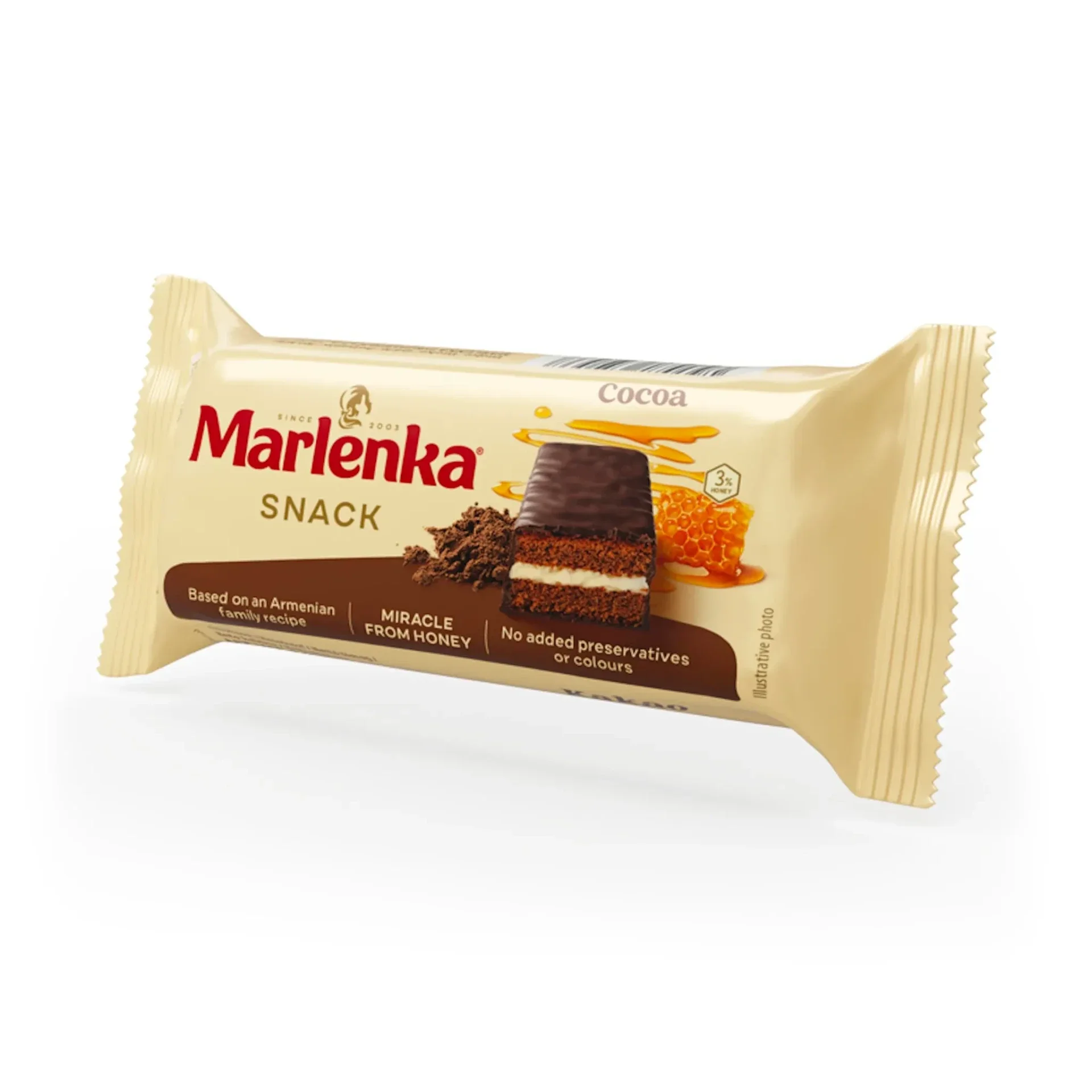 De MARLENKA® Honingsnack Cacao 50 g is een heerlijke combinatie van zachte honingcake en romige cacaovulling, verpakt in een handig formaat om overal mee naartoe te nemen. Deze snack bevat uitsluitend 100% natuurlijke ingrediënten, zonder kunstmatige toevoegingen, en is gebaseerd op een traditioneel Armeens familierecept